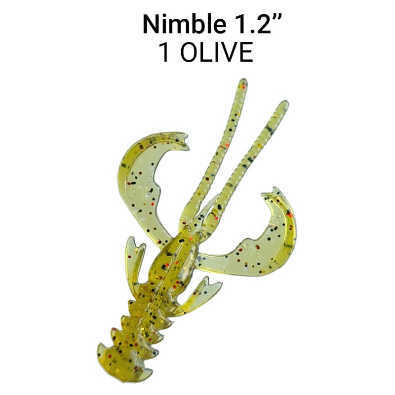 Crazy Fish Nimble 1.2” — трехсантиметровый рак с активными клешнями, которые после попадания в водоём сразу начинают попеременно или синхронно колебаться даже во время одной проводки в зависимости от потоков воды. Этот эффект оживляет приманку, провоцирую хищника на атаку. Хаос в движениях убегающей добычи, натуралистичность, беспрерывная размашистая работа без сбоев — в этом преимущество «Нимбла» перед виброхвостами и слагами в аналогичном размере.