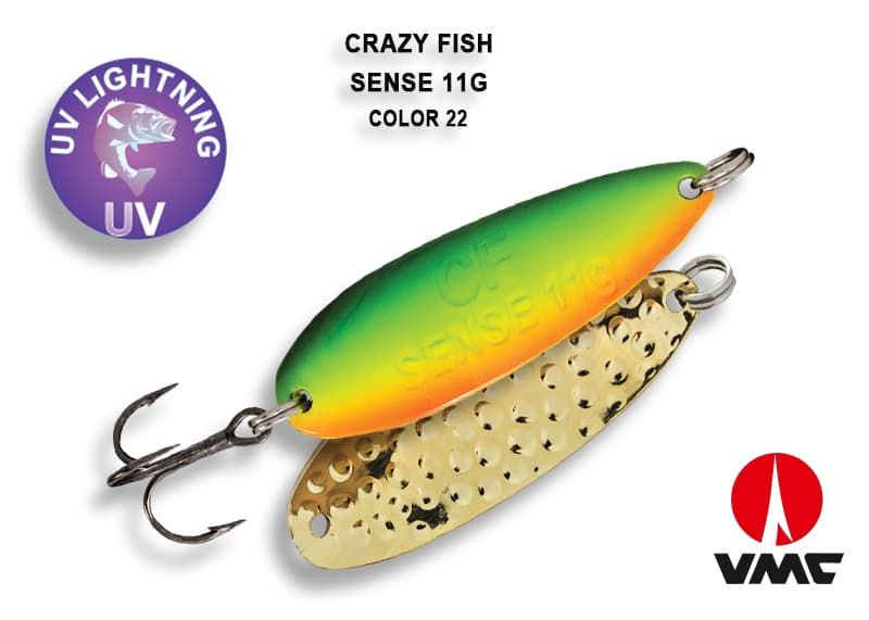 Crazy Fish Sense — колеблющаяся блесна весом 11 грамм с относительно широки телом и размашистой низкоамплитудной игрой. Это позволяет делать медленные проводки и хорошо собирать рыбу с более дальних дистанций. На падении блесна привлекательно «осыпается», поэтому равномерные проводки очень полезно чередовать с паузами, которые могут быть либо просто сбоем приманки и коротеньким падением, либо давать приманке сыпаться до самого дна.