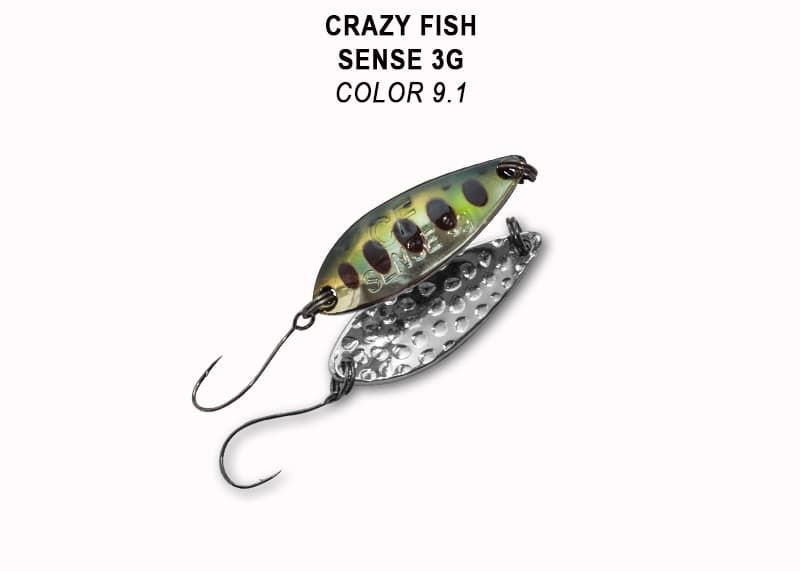 Crazy Fish Sense — небольшая колеблющаяся блесна весом 3 грамма с относительно широки телом и широкой, размашистой, низкоамплитудной игрой. Это позволяет делать медленные проводки и хорошо собирать рыбу с более дальних дистанций. На падении блесна привлекательно «осыпается», поэтому равномерные проводки очень полезно чередовать с паузами, которые могут быть либо просто сбоем приманки и коротеньким падением, либо давать приманке сыпаться до самого дна.