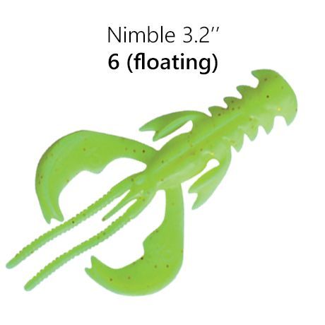 Crazy Fish Nimble 3.2” — рак с активными клешнями, которые после попадания в водоём сразу начинают попеременно или синхронно колебаться даже во время одной проводки в зависимости от потоков воды. Этот эффект оживляет приманку, провоцирую хищника на атаку. Хаос в движениях убегающей добычи, натуралистичность, беспрерывная размашистая работа без сбоев — в этом преимущество «Нимбла» перед виброхвостами и слагами в аналогичном размере. Такк же данная модель выполнена их екстра плавающего материала.