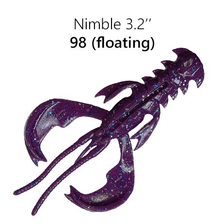 Crazy Fish Nimble 3.2” — рак с активными клешнями, которые после попадания в водоём сразу начинают попеременно или синхронно колебаться даже во время одной проводки в зависимости от потоков воды. Этот эффект оживляет приманку, провоцирую хищника на атаку. Хаос в движениях убегающей добычи, натуралистичность, беспрерывная размашистая работа без сбоев — в этом преимущество «Нимбла» перед виброхвостами и слагами в аналогичном размере. Такк же данная модель выполнена их екстра плавающего материала.